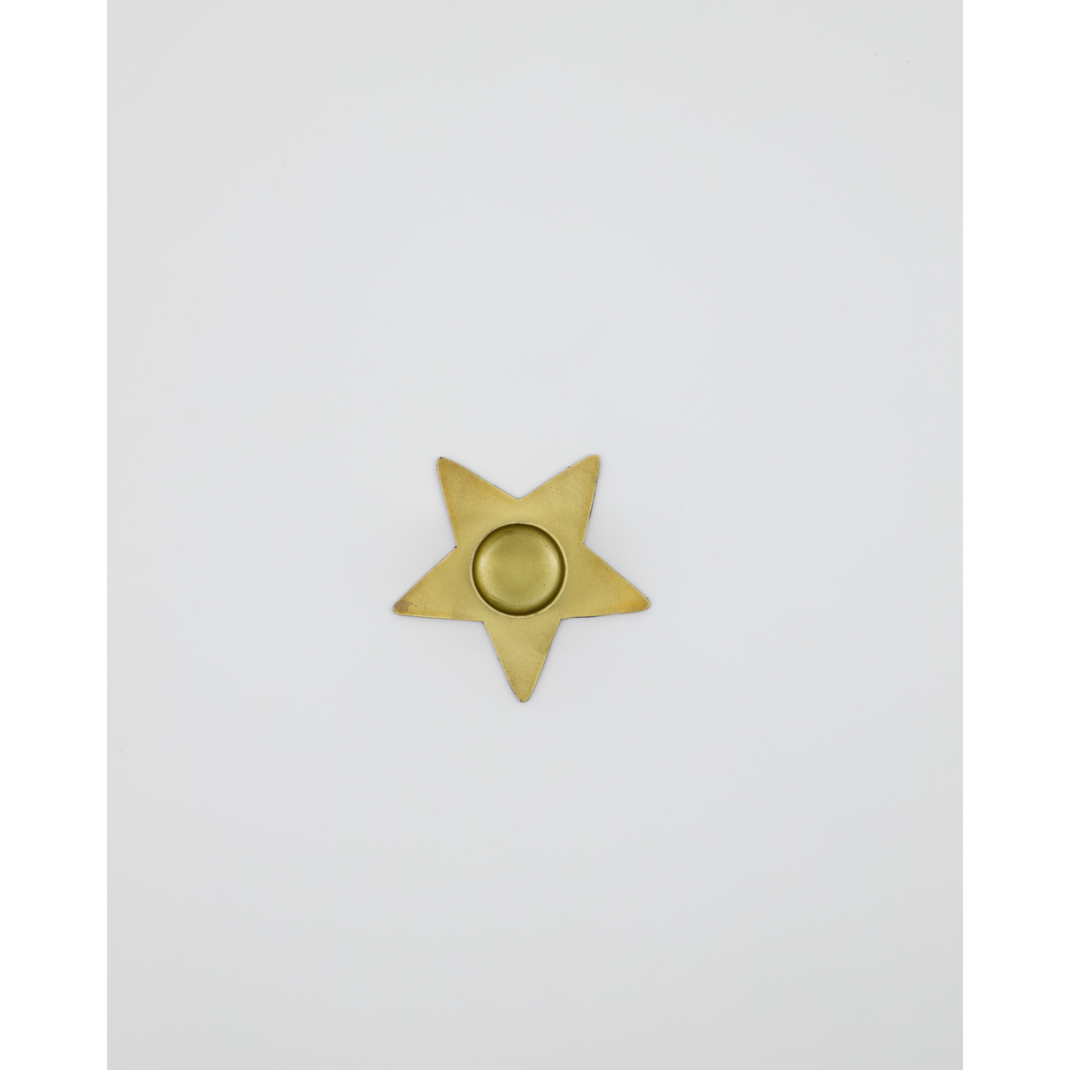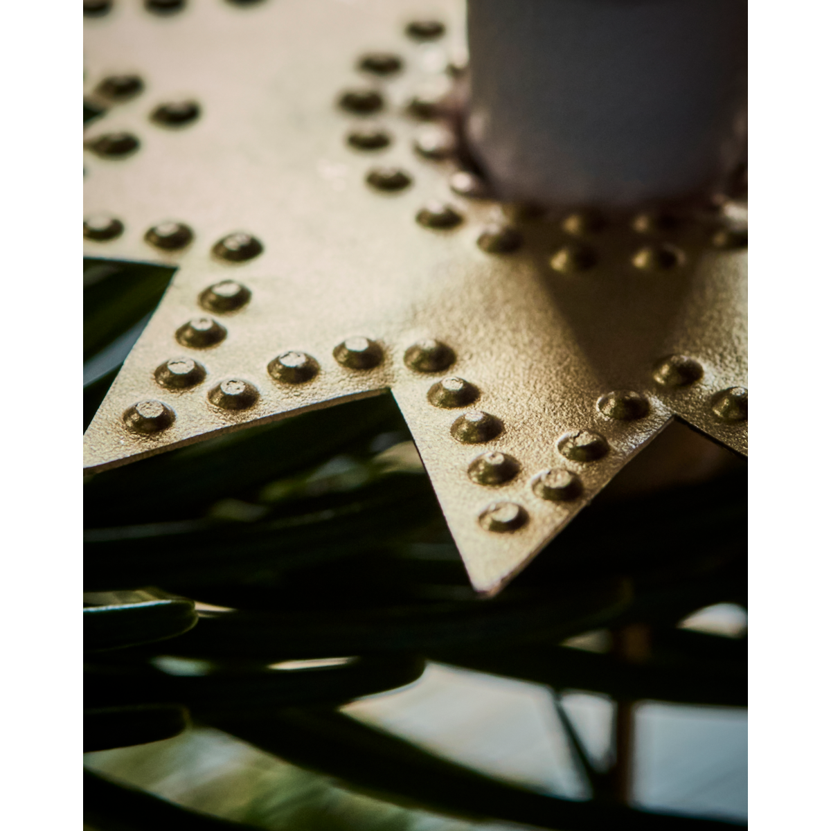Enhance your festive decor with this candle holder in antique brass. Crafted from durable iron, its circular structure features four candle cups, each perched on a decorative five-point star. This...